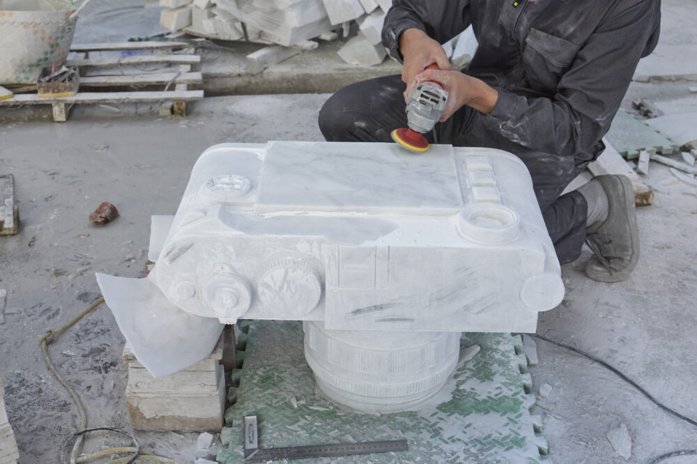 Das Werk stammt vom niederländischen Künstler Casper Braat, der für seine Arbeiten bekannt ist, in denen er Alltagsobjekte zu luxuriösen Kunstsymbolen erhebt. Für Leica hat Braat die legendäre Leica M11 Monochrom in weißem Carrara-Marmor detailgetreu nachgebildet. Die Skulptur steht auf einem schwarzen Sockel aus spanischem Marquina-Marmor und bildet in Größe und Form jedes technische Detail des Originals nach – von den Gravuren bis zu den Markierungen am Objektiv.