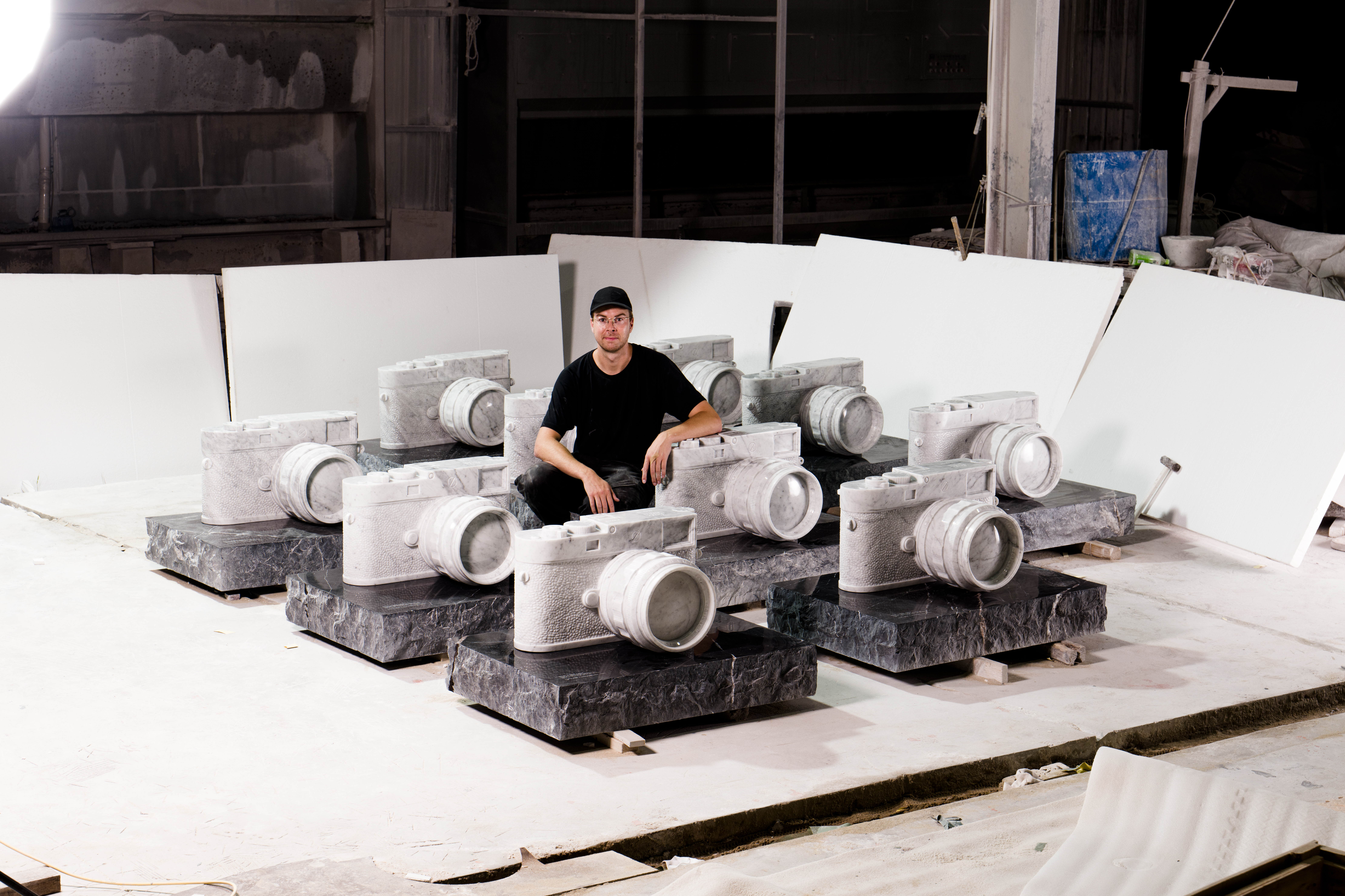 The sculpture was created by Dutch artist Casper Braat, known for transforming everyday objects into timeless works of art. In close collaboration with Leica Store Lisse (NL), Braat meticulously reproduced the Leica M11 Monochrom in marble, inverting its original black color into white stone. Every detail corresponds precisely to the real camera, from the engraved serial numbers to the lens markings.